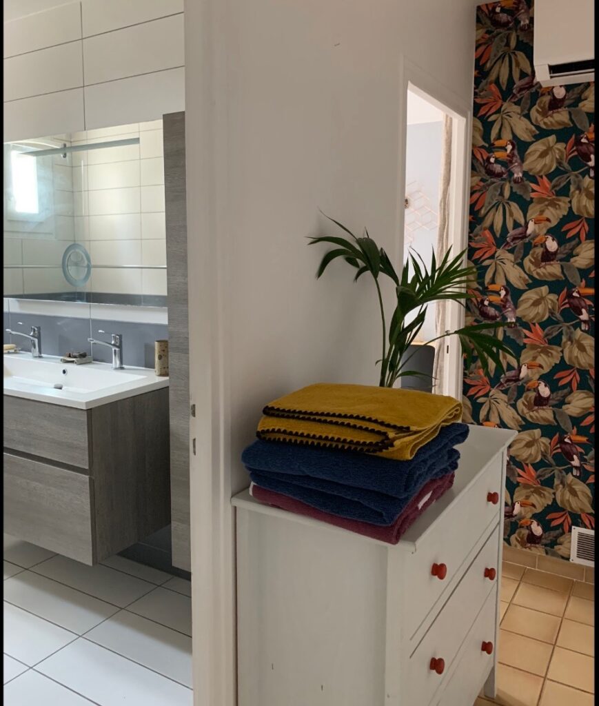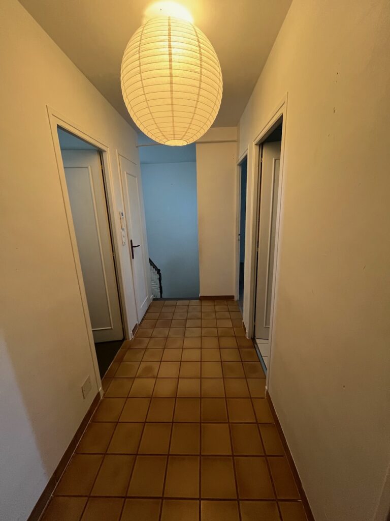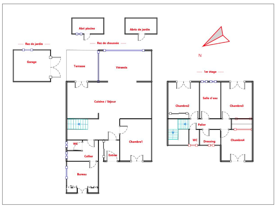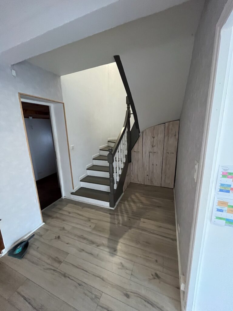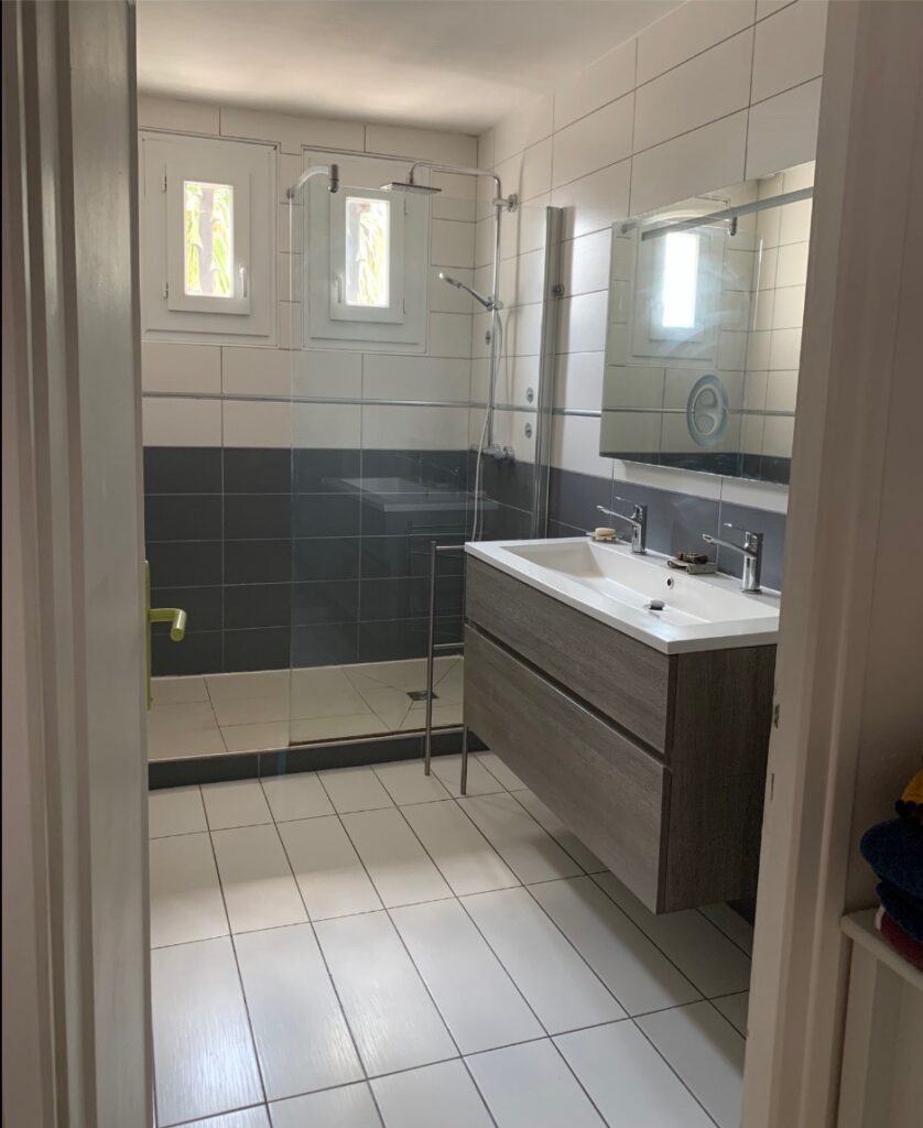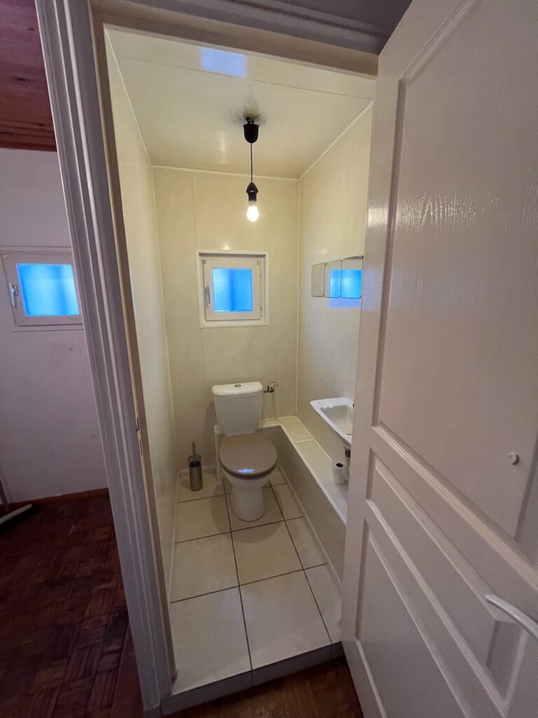 Au rez-de-chaussée vous avez un premier sas d’entrée, puis une entrée avec placard, une chambre avec grand placard, une buanderie avec WC et un bureau.