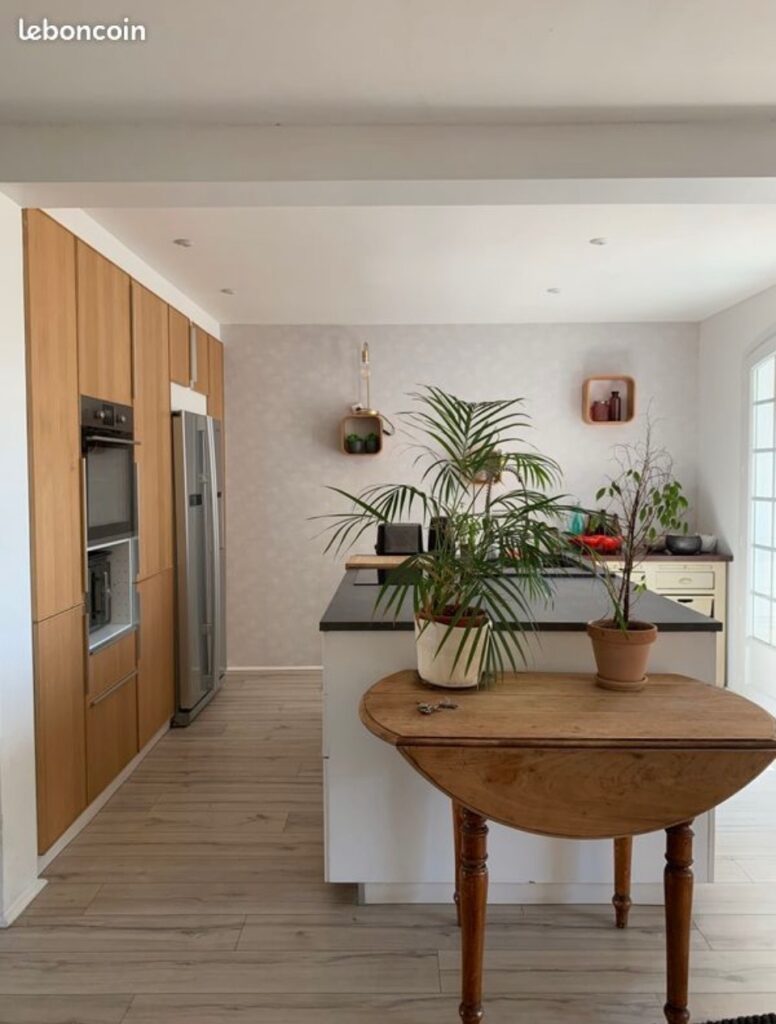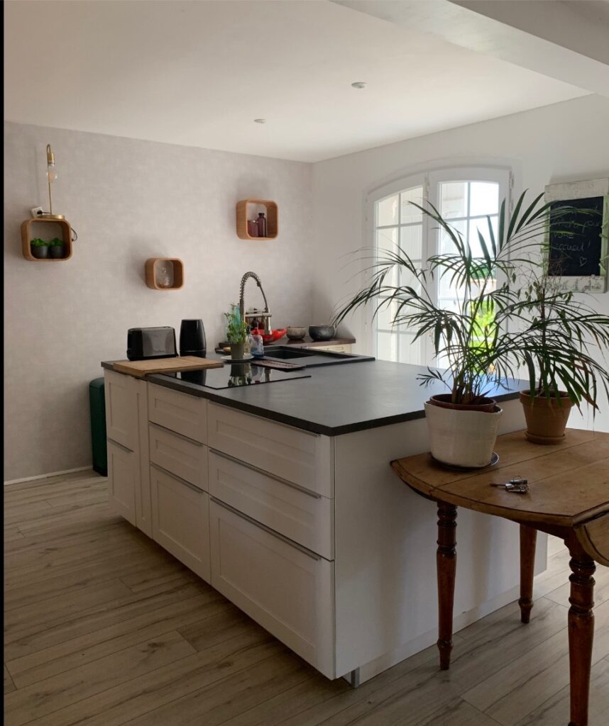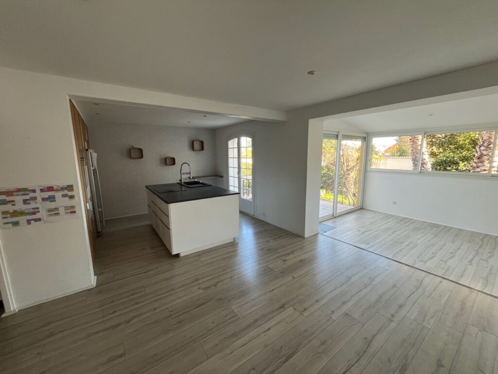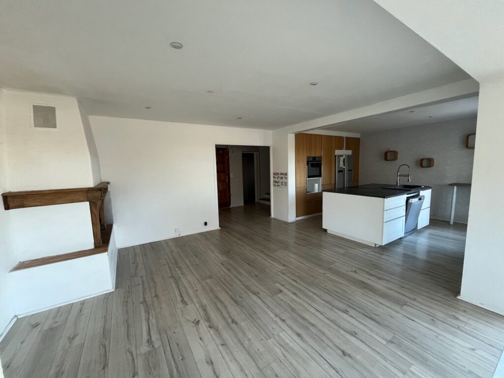 La pièce à vivre composée d’une cuisine équipée (frigo, plaque induction, four, lave-vaisselle) ouverte sur le salon avec une cheminée insert et la partie salle à manger qui s’ouvre via une baie vitrée vers la terrasse.