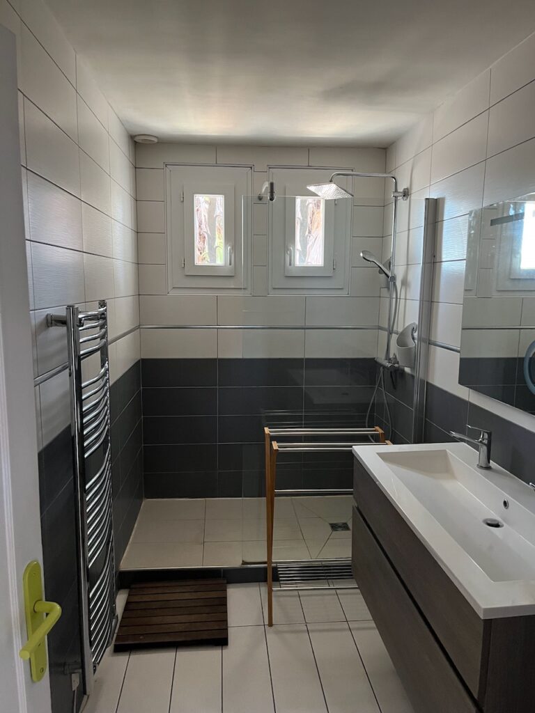 A l’étage, 3 chambres avec chacune leur placard, une salle d’eau avec double vasque, un WC et un espace rangement permettant d’accéder aux combles.